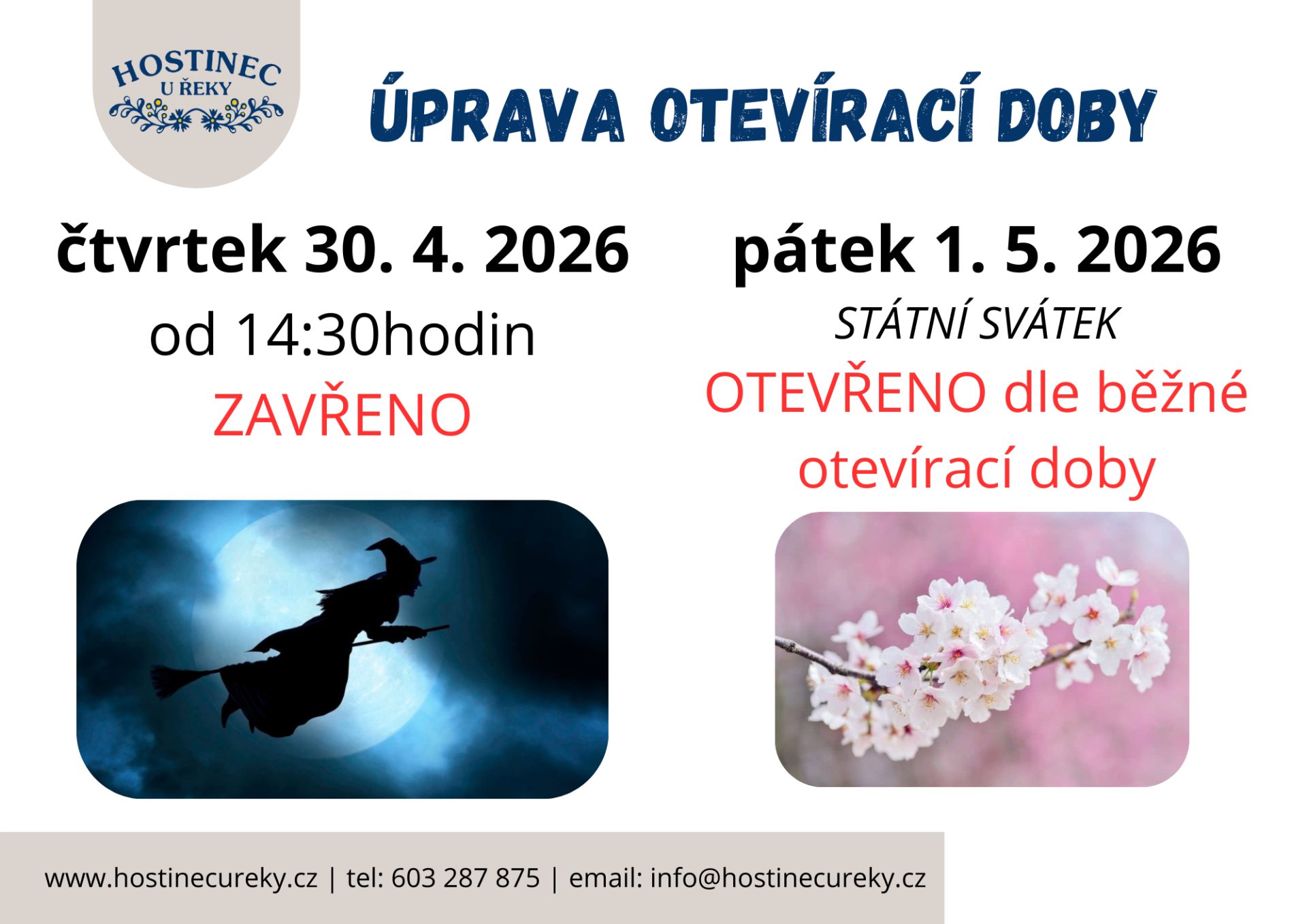 Ve čtvrtek vás necháme v klidu upálit čarodějnice (nebo v pořádku odletět! ) a sami si od 14:30 dáme krátkou pauzu. V pátek už se na vás ale moc těšíme – otevíráme v 11:00 rovnou na sváteční obídek!